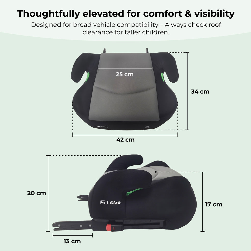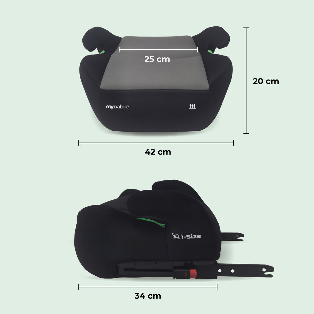 The My Babiie i-Size backless booster seat is suitable for children from 125-150 cm (approx. 6 to 12 years). You are safe in the knowledge that this booster seat is approved to R129 safety standards with the extra firm ISOFIX plus belt install. With a luxurious black and grey padded seat and padded armrests, this booster seat is designed to ensure your child travels in comfort and safety.