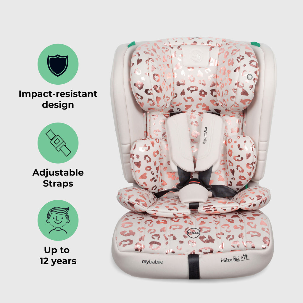 One Seat. Years of Adventures. With stylish blush leopard fabrics and a thoughtfully engineered design, the My Babiie i-Size 76–150cm Car Seat is built to adapt as your child grows from toddler to tween. Combining style with substance, this forward-facing toddler seat transitions from a secure harnessed mode for little ones to a high-back booster for bigger kids, offering extended use without sacrificing safety or comfort. Tested to the latest R129 i-Size standards and packed with parent-friendly features like a no-rethread harness, breathable padding, and simple seatbelt installation, it’s the perfect travel companion for every stage of childhood.