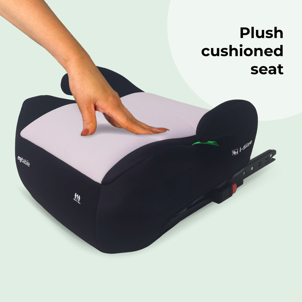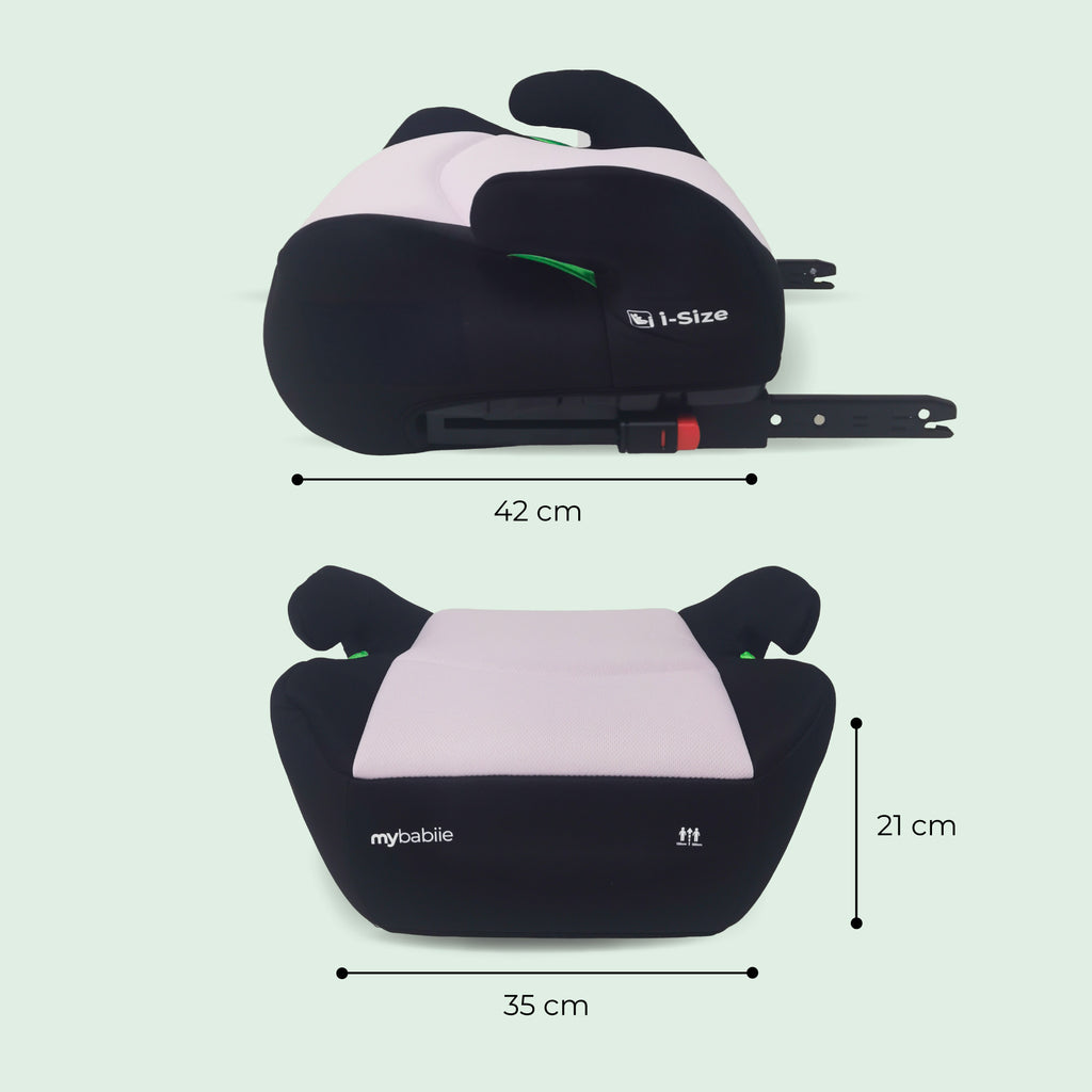 The My Babiie i-Size backless booster seat is suitable for children from 125-150 cm (approx. 6 to 12 years). You are safe in the knowledge that this booster seat is approved to R129 safety standards with the extra firm ISOFIX plus belt install. With a luxurious black and grey padded seat and padded armrests, this booster seat is designed to ensure your child travels in comfort and safety.
