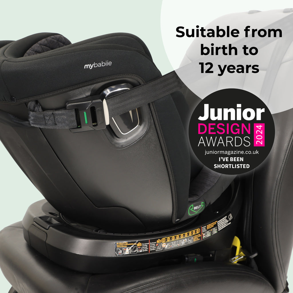 The My Babiie i-Size Top Tether Spin Car Seat meets the newest car seat safety standard, ECE R129 and are also i-Size certified. This means more detailed and rigorous testing, added side-impact testing, and at higher speeds. It also means the use of better technology, such as a new crash test dummy with more sensors that allows for a deeper and more detailed understanding.