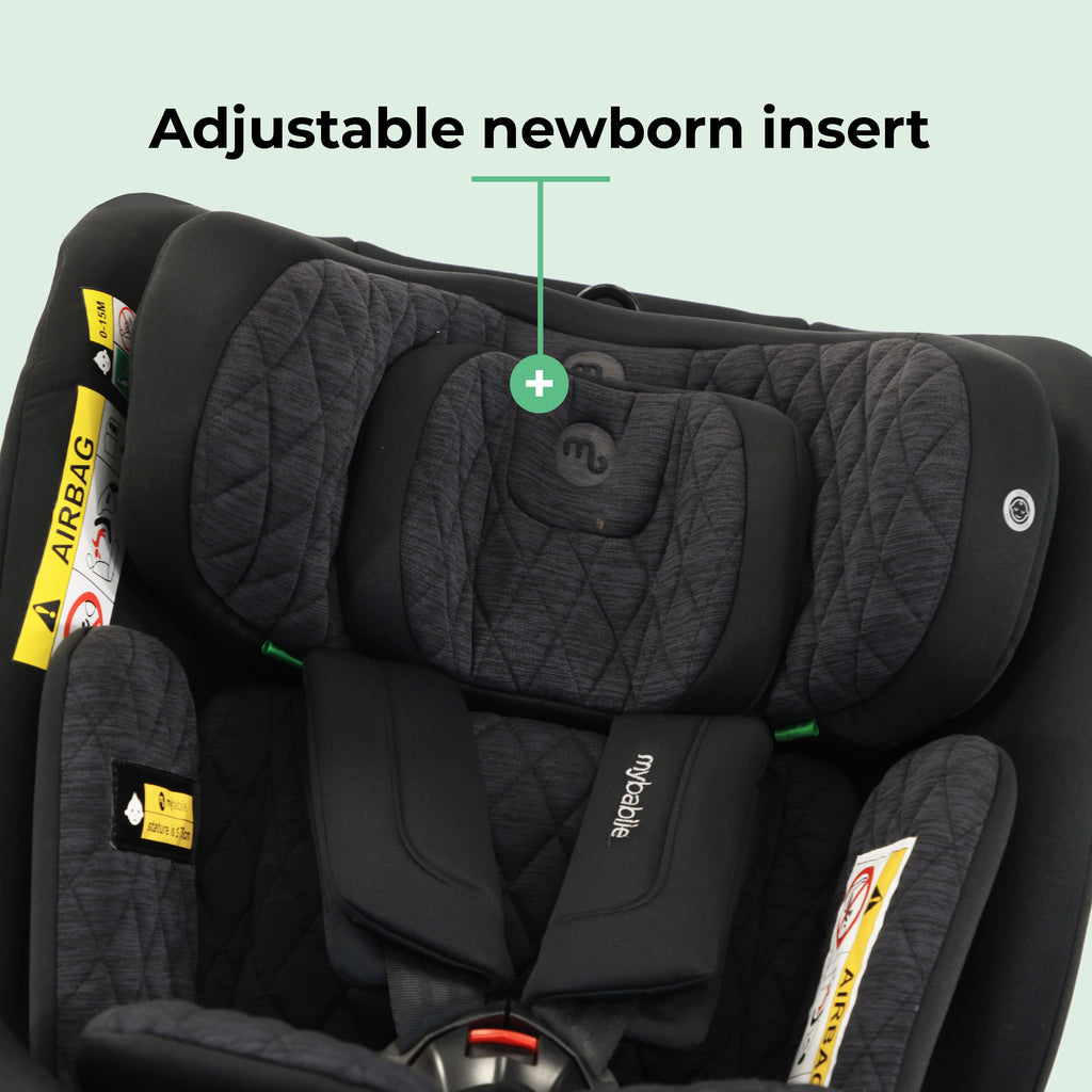 The My Babiie i-Size Spin car seat is an all stages car seat which means it can be used from birth up to 150cm (approx. 12 years). The seat spins to allow easy access to getting your child in and out and benefits from an extended rear facing seating position, meaning your child can stay rear facing up to 105cm (approx. 4 years). With a luxurious grey melange padded seat and padded newborn insert, this car seat seat is designed to ensure your child travels in comfort and safety.