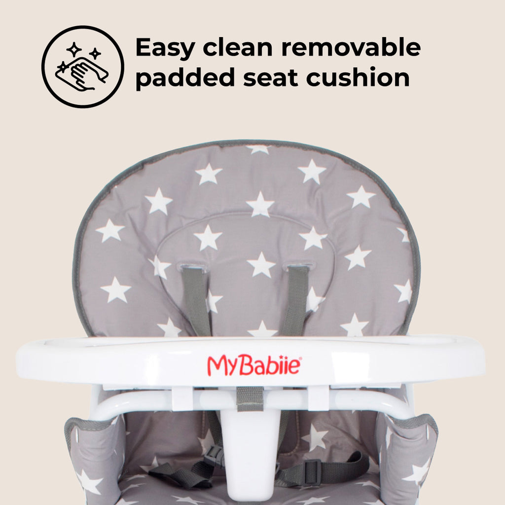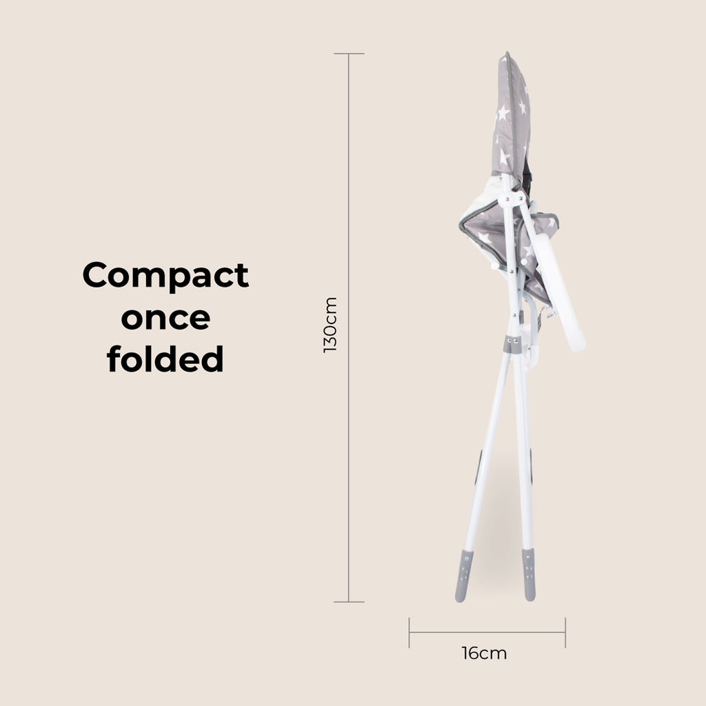 This cute compact grey stars highchair is ultra lightweight and suitable for any occasion. The padded seat with a five-point harness not only looks great but is super comfy and can be wiped clean easily after use. On the tray is a handy cup holder and a foot rest means your little one is comfy for mealtimes. After use, this highchair can be folded and stored out the way with ease.