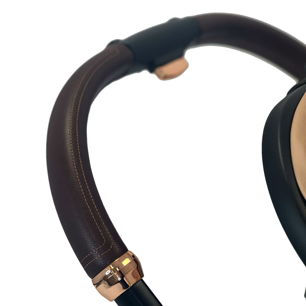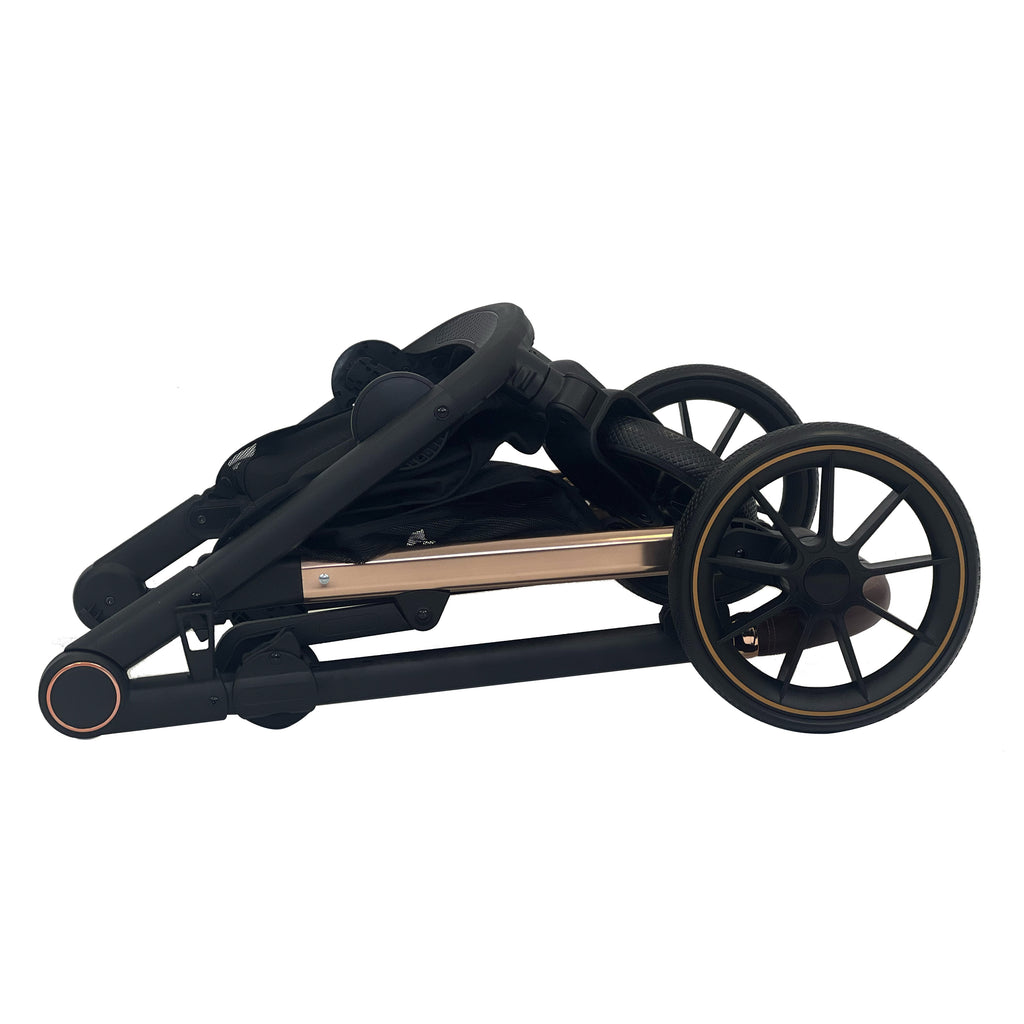 The pushchair features a luxurious leatherette telescopic handle, offering a stylish and comfortable grip for parents on the go, enhancing both functionality and aesthetics.