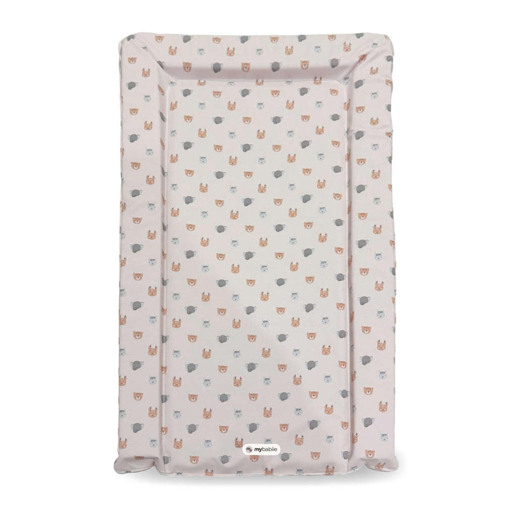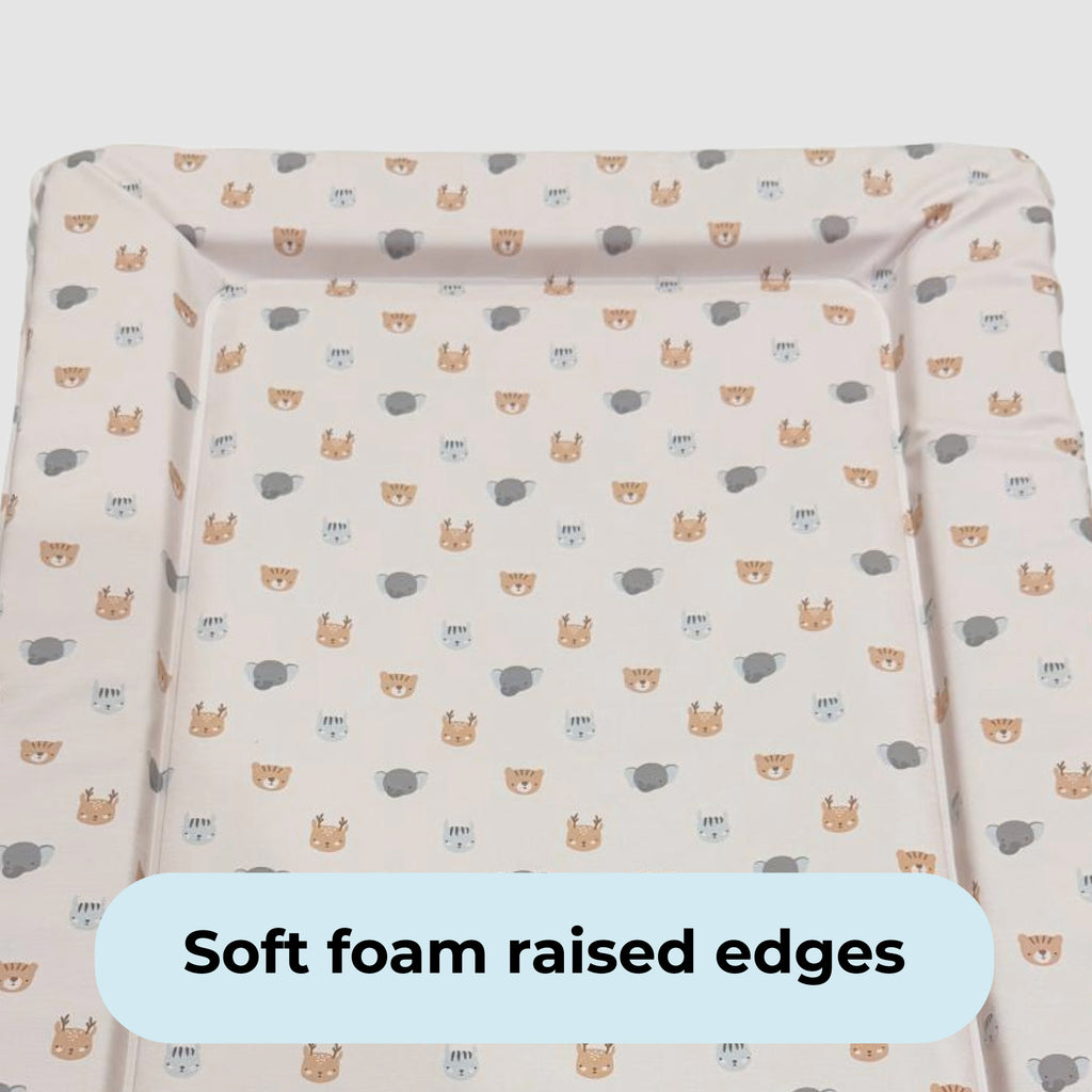 This cute animal print changing mat is soft, comfortable and stylish. This padded changing mat has raised sides and is suitable from birth. Made with non-toxic PVC this changing mat is easy to wipe clean and the stylish, eye catching safari design will brighten up any nursery!