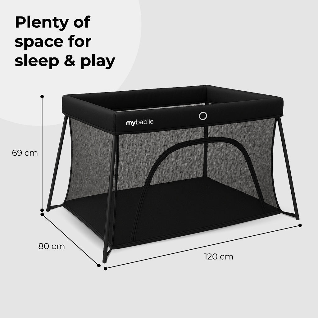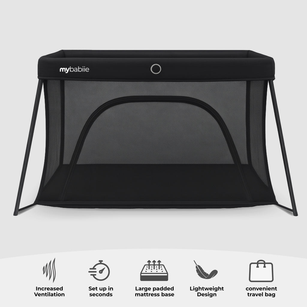 The My Babiie Air-Light Travel Cot in stylish black is the perfect companion for parents seeking a stylish and practical sleep and play solution for their baby. Designed with convenience in mind, this cot combines lightweight portability with premium functionality. Whether you're at home or on the go, the Air-Light folds down effortlessly into a compact travel bag, making it ideal for weekends away, holidays, or simply moving between rooms.