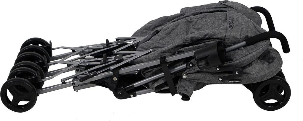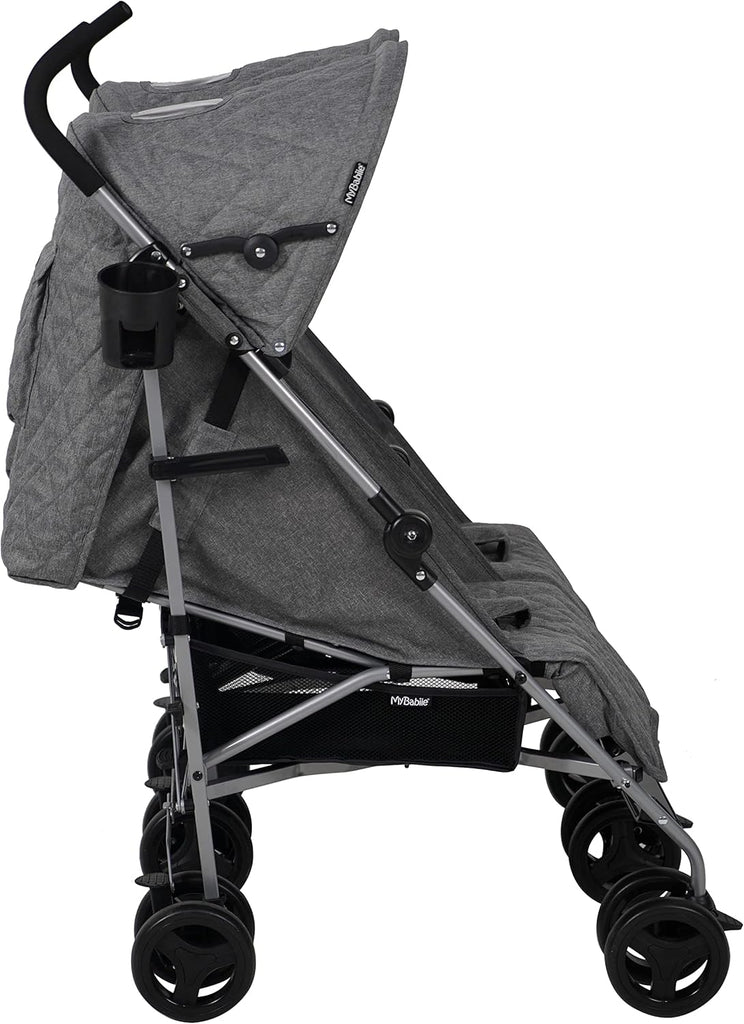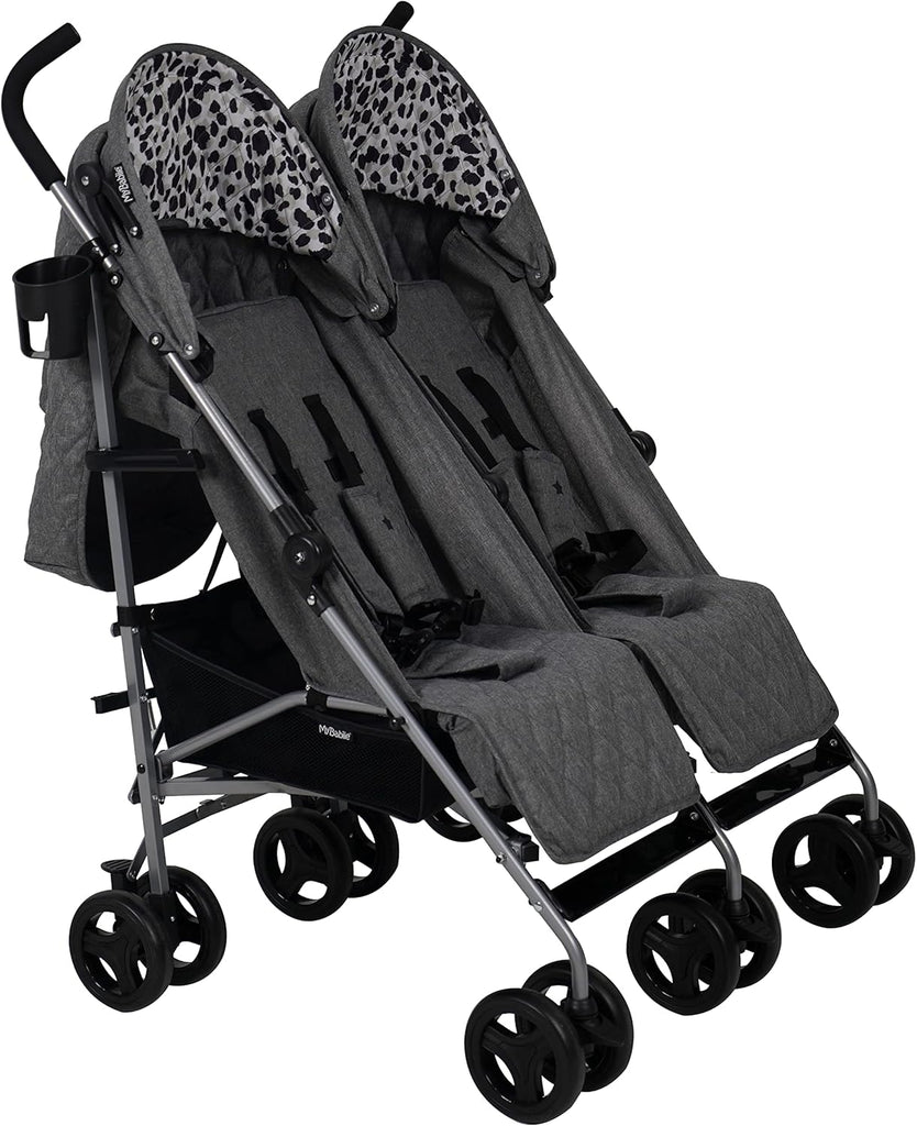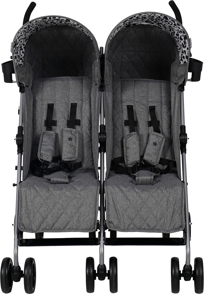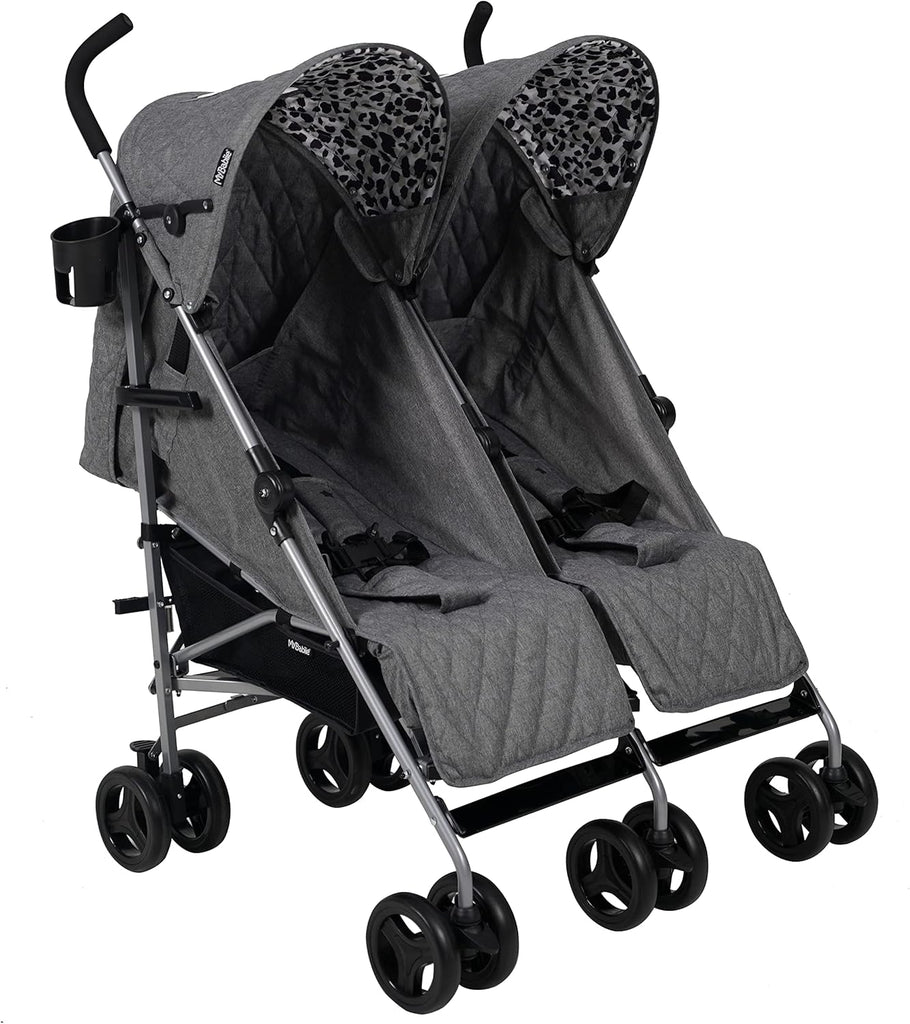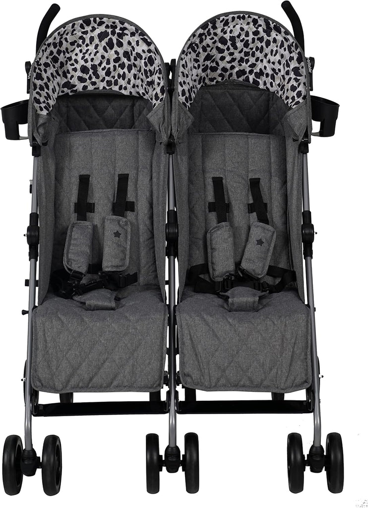 The My Babiie trend-setting grey melange double stroller was created so your littles can stroll together in style. With stylish grey melange fabrics and a cool leopard print pattern inside of the hoods, this is the perfect affordable solution for firstborns & siblings or twins. This twin stroller is lightweight and super easy to fold away and open for its class, but still sturdy enough to handle 2 kids up to 15kg (each).