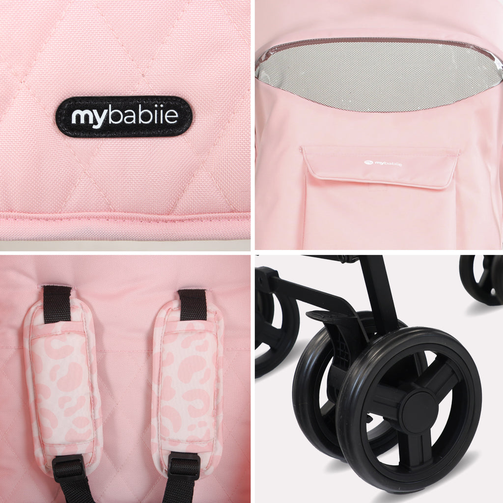 Designed to make family adventures smoother and more stylish, the My Babiie MB01 Lightweight Stroller combines convenience with sleek design. With its ultra-compact frame and effortless manoeuvrability, the MB01 is perfect for parents on the go. Whether navigating busy city streets or strolling through the park, this stroller delivers comfort, performance, and practicality - all wrapped in a stylish pink leopard fabric finished with elegant quilted stitching.