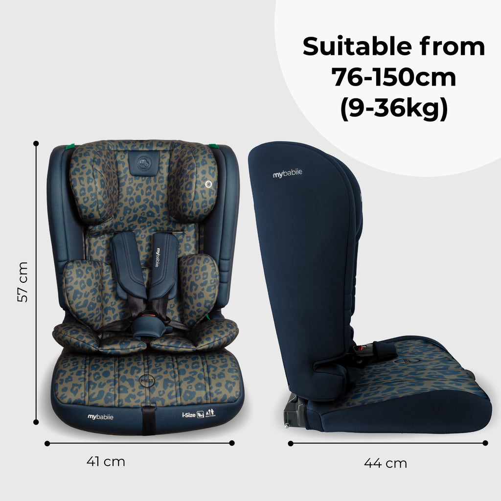 One Seat. Years of Adventures. With stylish navy/olive leopard print fabrics and a thoughtfully engineered design, the My Babiie i-Size 76–150cm Car Seat is built to adapt as your child grows from toddler to tween. Combining style with substance, this forward-facing toddler seat transitions from a secure harnessed mode for little ones to a high-back booster for bigger kids, offering extended use without sacrificing safety or comfort. Tested to the latest R129 i-Size standards and packed with parent-friendly features like a no-rethread harness, breathable padding, and simple seatbelt installation, it’s the perfect travel companion for every stage of childhood.