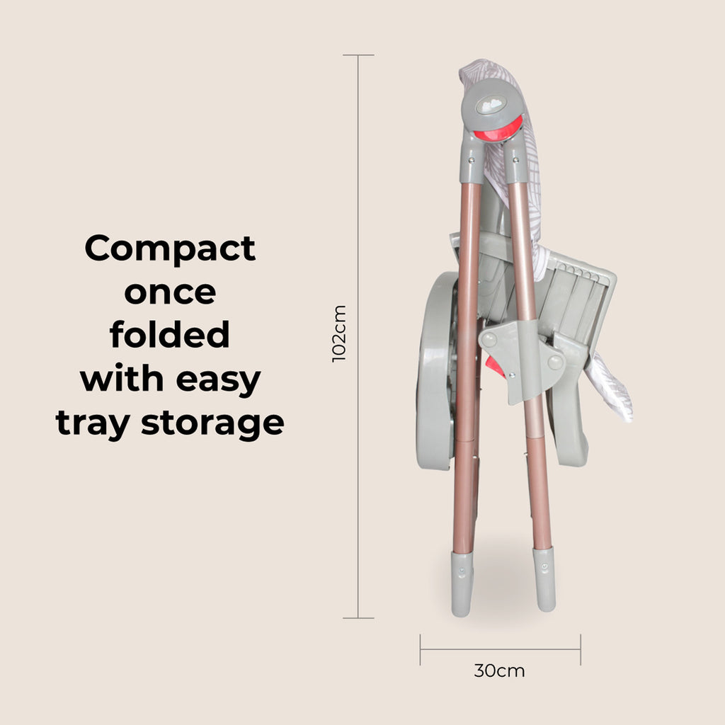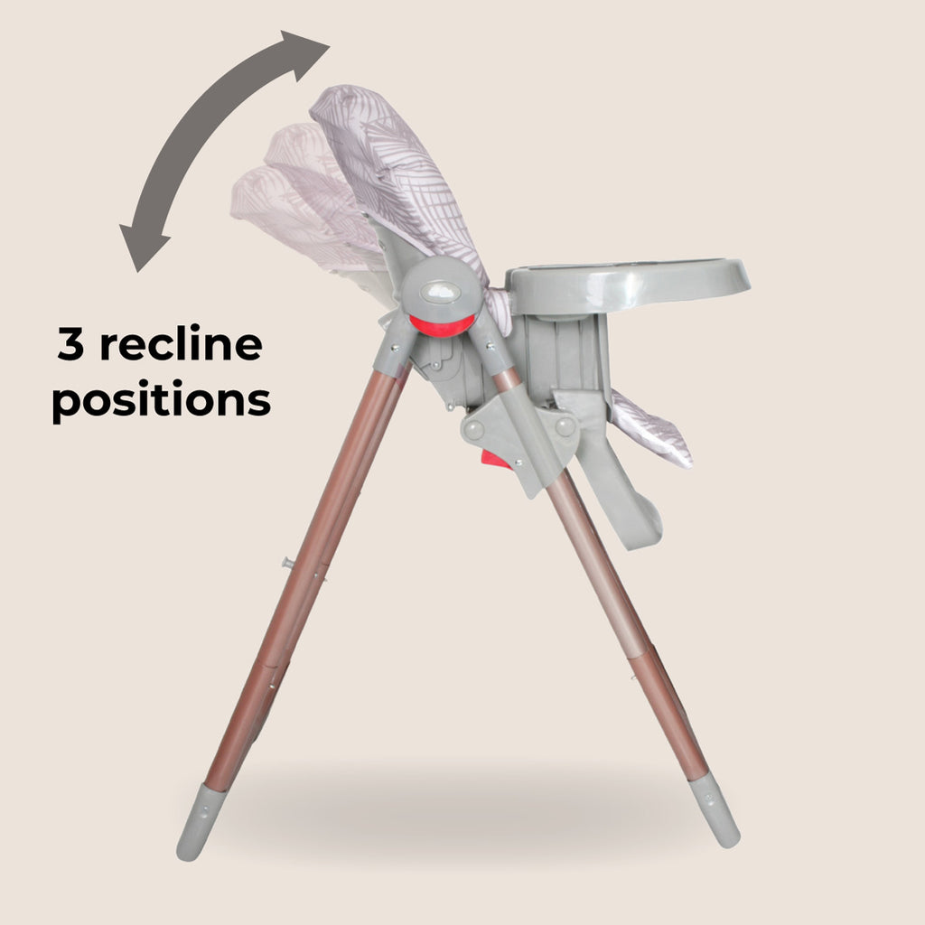 The highchair boasts a stylish grey tropical print design for an on-trend, refined look. The highchair has a stylish grey frame and is cleverly styled for little ones that love to dream big. This highchair is sleek & stowable. Its two-part removable tray conveniently detaches when done and clips on the back of the highchair for a slim silhouette. With an easy-fold design, it stands on its own when folded and can be stored out of the way when not in use. But with an eye-catching and stylish design like this, you can be just as happy leaving it up in the kitchen all of the time!