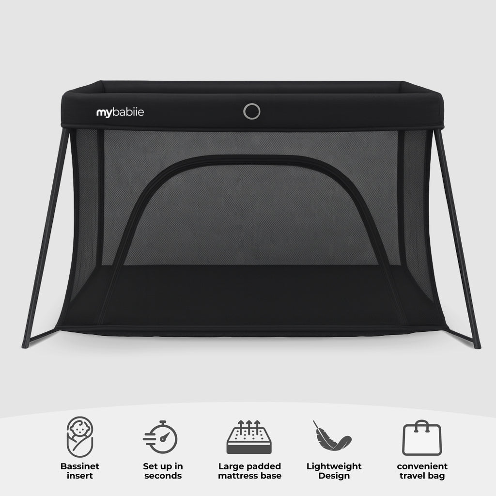 The My Babiie Air-Light 3-in-1 Travel Cot in classic black is the ultimate all-rounder for modern parents, effortlessly combining a travel cot, co-sleeper, and playpen into one sleek and practical design. Created with versatility and portability in mind, this multi-functional cot is perfect for everyday use at home or for restful nights away.