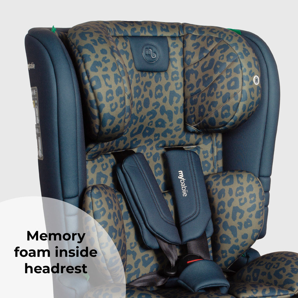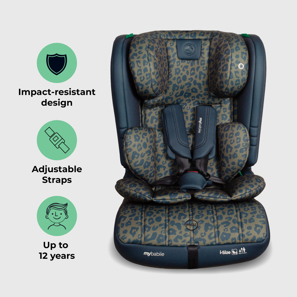 One Seat. Years of Adventures. With stylish navy/olive leopard print fabrics and a thoughtfully engineered design, the My Babiie i-Size 76–150cm Car Seat is built to adapt as your child grows from toddler to tween. Combining style with substance, this forward-facing toddler seat transitions from a secure harnessed mode for little ones to a high-back booster for bigger kids, offering extended use without sacrificing safety or comfort. Tested to the latest R129 i-Size standards and packed with parent-friendly features like a no-rethread harness, breathable padding, and simple seatbelt installation, it’s the perfect travel companion for every stage of childhood.