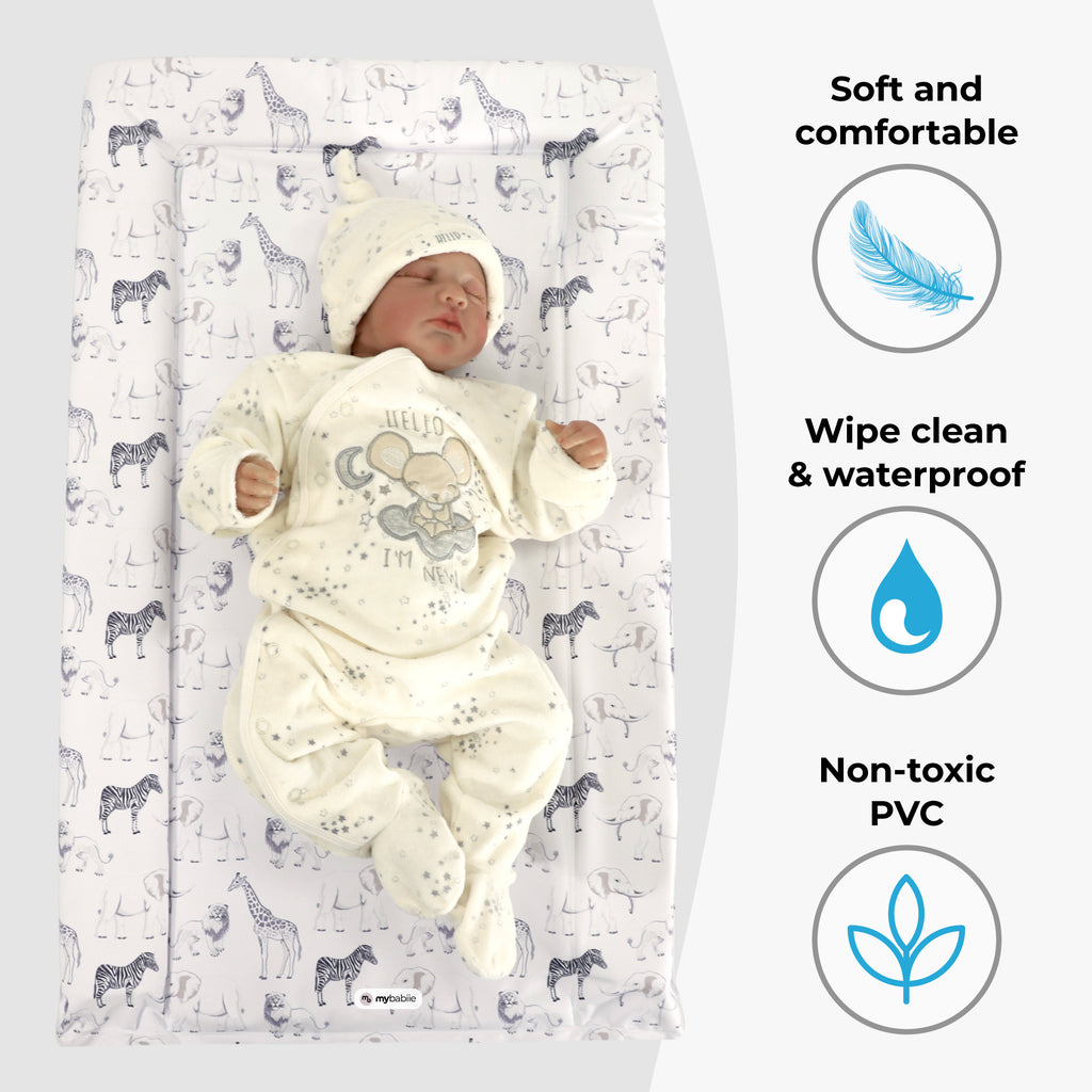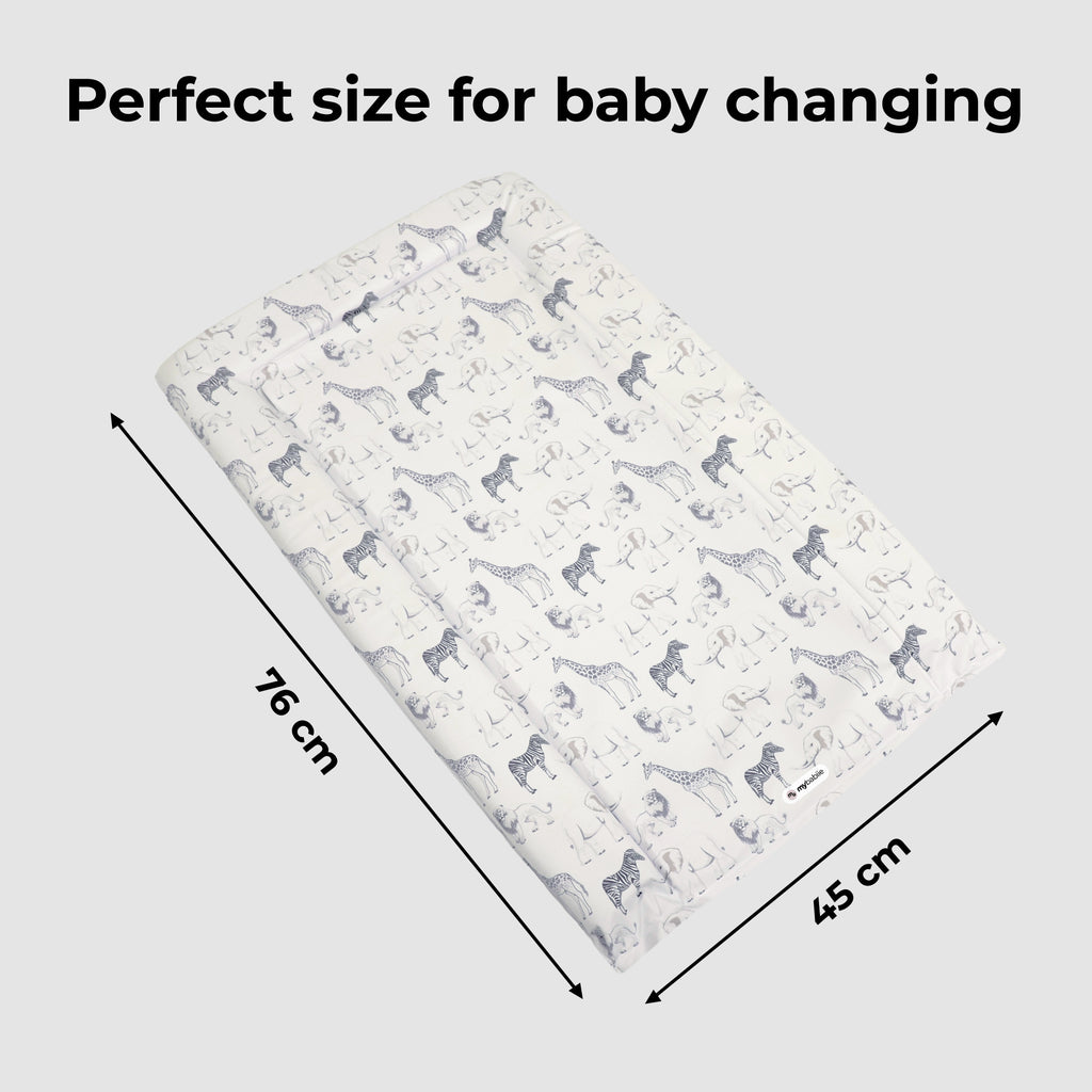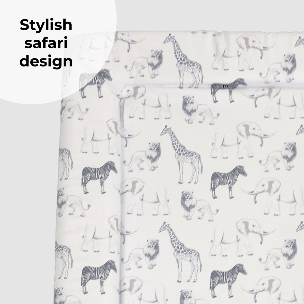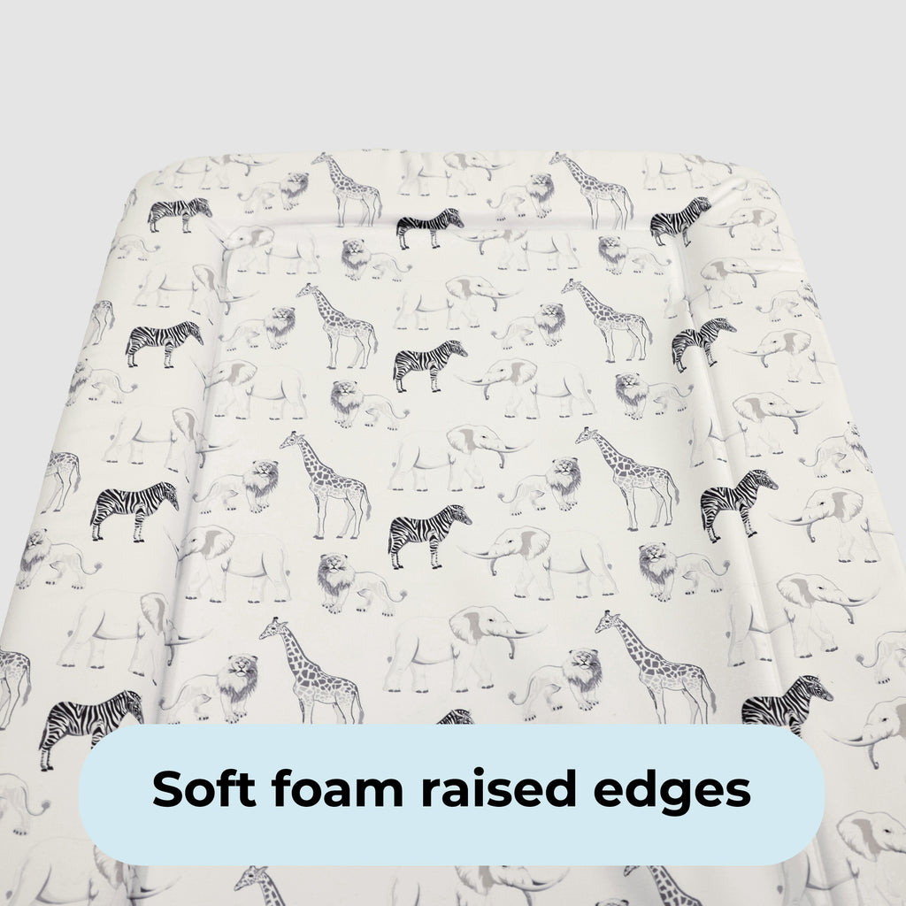 This safari changing mat combines comfort, practicality and style. Softly padded with raised sides for added support, it’s suitable from birth and designed to keep your baby comfortable during every change. Made from non-toxic PVC, the mat is easy to wipe clean, while the eye-catching safari print adds a playful touch that brightens any nursery.
